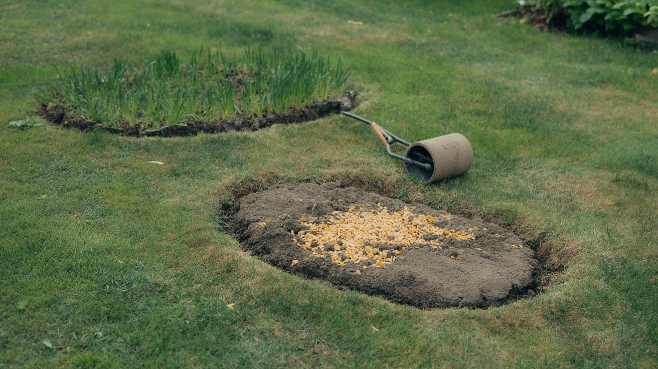 For slopes, lay erosion-control netting over the mulch to prevent washout until germination anchors the seedlings. Check our comparison of starter vs. maintenance fertilizers if your patch mix does not include a starter formula.